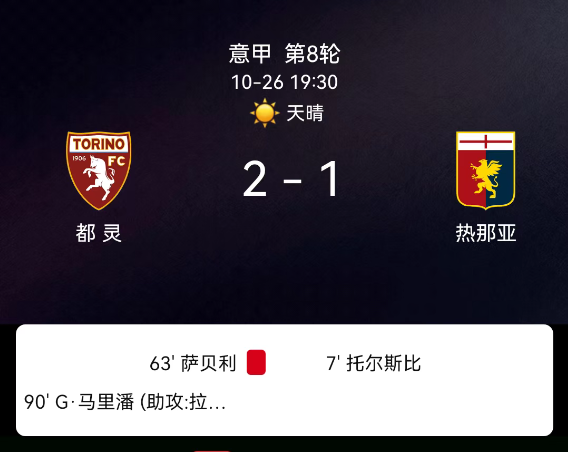 北京时间10月26日,意大利足球顶级联赛第8轮,都灵迎战热那亚。第5分钟,热那亚球员吃黄;第7分钟,托斯比破门,热那亚1-0;第15分钟,都灵球员吃黄;第42分钟,热那亚球员吃黄;第53分钟,热那亚球员吃黄;第63分钟,萨贝利乌龙,都灵1-1;第90分钟,马里潘破门,都灵2-1。最终比分,都灵2-1热那亚。