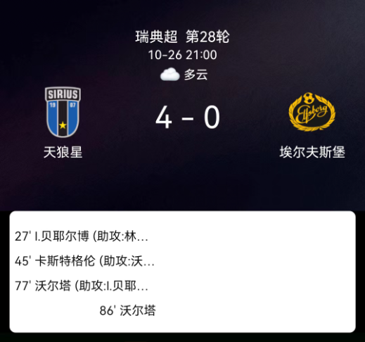 北京时间10月26日,瑞典足球超级联赛第28轮,天狼星迎战埃尔夫斯堡。第27分钟,IsakBjerkebo破门,天狼星1-0;第45分钟,卡斯特格伦破门,天狼星2-0;第63分钟,埃尔夫斯堡球员吃黄;第77分钟,瓦尔塔破门,天狼星3-0;第86分钟,瓦尔塔破门,天狼星4-0。最终比分,天狼星4-0埃尔夫斯堡。