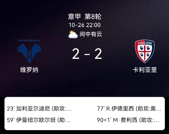 北京时间10月26日,意甲联赛第8轮,维罗纳迎战卡利亚里。第23分钟,加利亚尔迪尼破门,维罗纳1-0;第45分钟,维罗纳球员吃黄;第59分钟,吉夫特-奥尔班破门,维罗纳2-0;第77分钟,里亚德-伊德里西破门,卡利亚里1-2;第90+2分钟,费利奇破门,卡利亚里2-2。最终比分,维罗纳2-2卡利亚里。