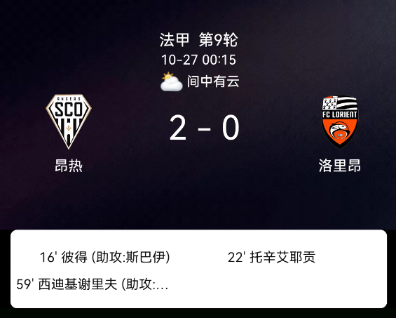 北京时间10月27日,法甲联赛第9轮,昂热迎战洛里昂。第16分钟,普罗斯珀-皮特破门,昂热1-0;第41分钟,洛里昂球员吃黄;第59分钟,西迪基-谢里夫破门,昂热2-0。最终比分,昂热2-0洛里昂。