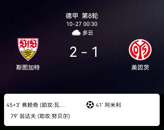 北京时间10月27日,德甲第8轮,斯图加特迎战美因茨。第41分钟,阿米里破门,美因茨1-0;第45+4分钟,菲里希破门,斯图加特1-1;第79分钟,昂达夫破门,斯图加特2-1。最终比分,斯图加特2-1美因茨。