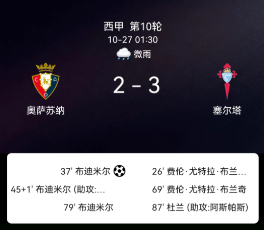 北京时间10月27日,西班牙足球甲级联赛第10轮,奥萨苏纳迎战塞尔塔。第13分钟,胡特格拉吃黄;第26分钟,胡特格拉破门,塞尔塔1-0;第37分钟,布季米尔破门,奥萨苏纳1-1;第45+1分钟,布季米尔破门,奥萨苏纳2-1;第62分钟,卡特纳吃黄;第69分钟,胡特格拉破门,塞尔塔2-2;第87分钟,巴勃罗-杜兰破门,塞尔塔3-2。最终比分,奥萨苏纳2-3塞尔塔。