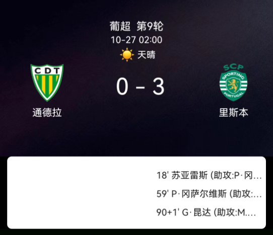 北京时间10月27日,葡萄牙足球超级联赛第9轮,通德拉迎战里斯本竞技。第20分钟,通德拉球员吃黄;第31分钟,佩德罗-多斯桑托斯吃黄;第18分钟,路易斯-苏亚雷斯破门,里斯本竞技1-0;第59分钟,佩德罗-贡萨尔维斯破门,里斯本竞技2-0;第90+2分钟,热奥瓦尼-昆达破门,里斯本竞技3-0。最终比分,通德拉0-3里斯本竞技。