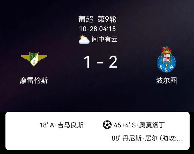 北京时间10月28日,葡萄牙足球超级联赛第9轮,摩雷伦斯迎战波尔图。第18分钟,阿兰-索萨破门,摩雷伦斯1-0;第35分钟,摩雷伦斯球员吃黄;第45+4分钟,奥莫罗迪翁破门,波尔图1-1;第72分钟,波尔图球员吃黄;第88分钟,德尼兹-居尔破门,波尔图2-1。最终比分,摩雷伦斯1-2波尔图。