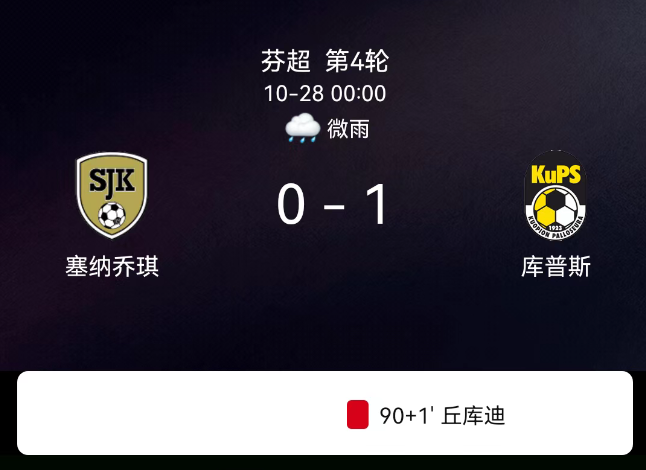 北京时间10月28日,芬兰足球超级联赛争冠组第4轮,塞纳乔琪迎战库普斯。第35分钟,塞纳乔琪球员吃黄;第68分钟,库普斯球员吃黄;第90分钟,丘库迪乌龙,库普斯1-0。最终比分,塞纳乔琪0-1库普斯。