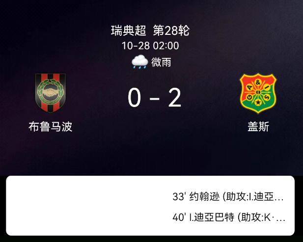 北京时间10月28日,瑞典足球超级联赛第28轮,布鲁马波迎战盖斯。第25分钟,布鲁马波球员吃黄;第33分钟,约翰逊破门,盖斯1-0;第40分钟,易卜拉欣-迪亚巴特破门,盖斯2-0;第78分钟,盖斯球员吃黄。最终比分,布鲁马波0-2盖斯。