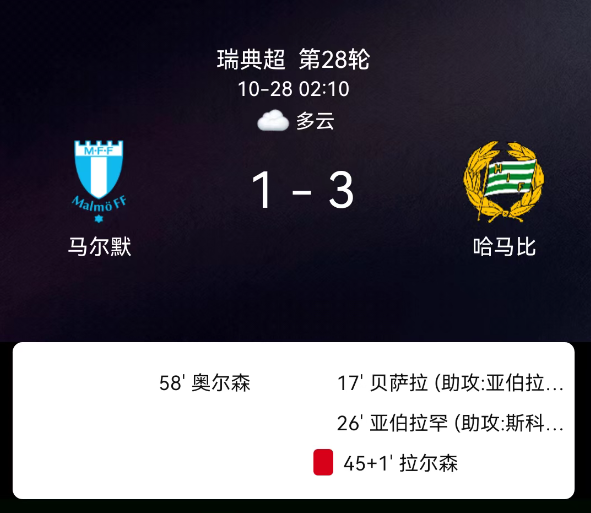 北京时间10月28日,瑞典足球超级联赛第28轮,马尔默迎战哈马比。第17分钟,贝萨拉破门,哈马比1-0;第26分钟,亚伯拉罕破门,哈马比2-0;第33分钟,莱维奇吃黄;第45+1分钟,斯特里格-拉森乌龙,哈马比3-0;第50分钟,哈克萨巴诺维奇吃黄;第52分钟,扬松吃黄;第58分钟,马丁-奥尔松破门,马尔默1-3。最终比分,马尔默1-3哈马比。