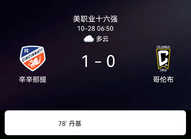 北京时间10月28日,美职联季后赛1/8决赛,辛辛那提迎战哥伦布机员。第42分钟,哥伦布机员球员吃黄;第65分钟,辛辛那提球员吃黄;第78分钟,凯文-登凯伊破门,辛辛那提1-0。最终比分,辛辛那提1-0哥伦布机员。