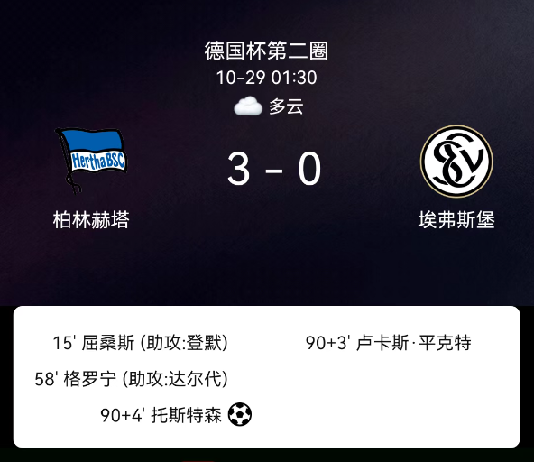 北京时间10月29日,德国足协杯第二轮,柏林赫塔迎战埃弗斯堡。第15分钟,屈桑斯破门,柏林赫塔1-0;第58分钟,格罗宁破门,柏林赫塔2-0;第90+3分钟,卢卡斯-平克特吃黄;第90+4分钟,托斯特森破门,柏林赫塔3-0。最终比分,柏林赫塔3-0埃弗斯堡。