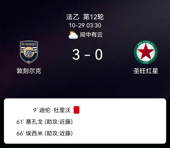 北京时间10月29日,法国足球乙级联赛第12轮,敦刻尔克迎战红星。第9分钟,DylanDurivaux乌龙,敦刻尔克1-0;第38分钟,红星球员吃黄;第61分钟,塞孔戈破门,敦刻尔克2-0;第66分钟,埃西米破门,敦刻尔克3-0。最终比分,敦刻尔克3-0红星。