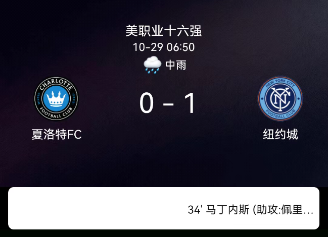 北京时间10月29日,美国职业大联盟1/8决赛,夏洛特迎战纽约城。第28分钟,夏洛特球员吃黄;第34分钟,阿德里安-马丁内斯破门,纽约城1-0。最终比分,夏洛特0-1纽约城。