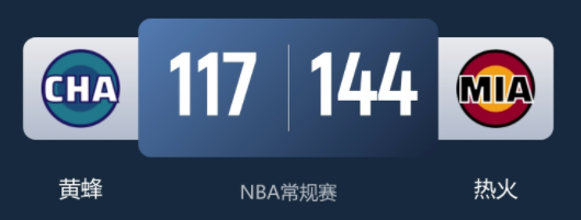 下半场易边再战,黄蜂队连续命中三分,打出一波21 - 8的攻击波,一度将分差缩小至3分。关键时刻,阿德巴约挺身而出,里突外投连得7分,热火队随即回敬一波11 - 0的攻势,稳住了场上局势。三节比赛结束,热火队领先17分。末节,热火队乘胜追击,继续扩大领先优势至20分以上,黄蜂队无力回天。最终,热火队以144 - 117轻松战胜黄蜂队。