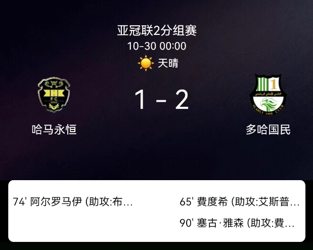 北京时间10月30日,亚足联冠军联赛二级联赛小组赛第5轮,永恒体育迎战多哈国民。第50分钟,永恒体育球员吃黄;第65分钟,弗图破门,多哈国民1-0;第74分钟,穆罕默德-罗迈希破门,永恒体育1-1;第90分钟,扬萨内破门,多哈国民2-1。最终比分,永恒体育1-2多哈国民。