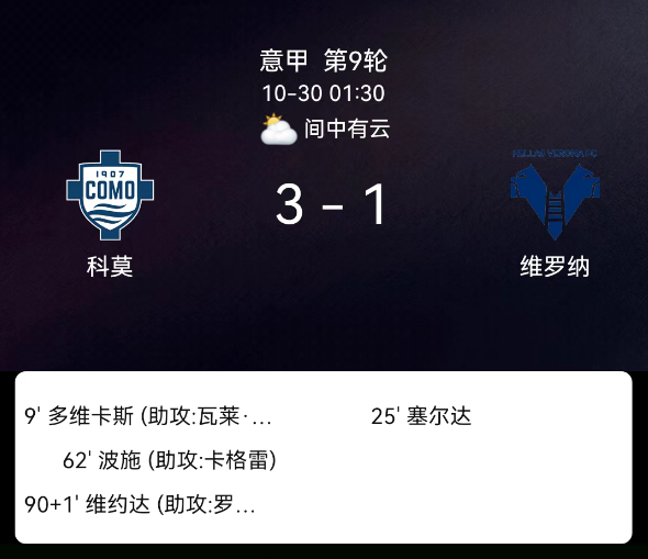 北京时间10月30日,意大利足球顶级联赛第9轮,科莫迎战维罗纳。第9分钟,杜维卡斯破门,科莫1-0;第25分钟,塞尔达破门,维罗纳1-1;第26分钟,维罗纳球员吃黄;第62分钟,斯特凡-波施破门,科莫2-1;第90+2分钟,沃伊沃达破门,科莫3-1。最终比分,科莫3-1维罗纳。