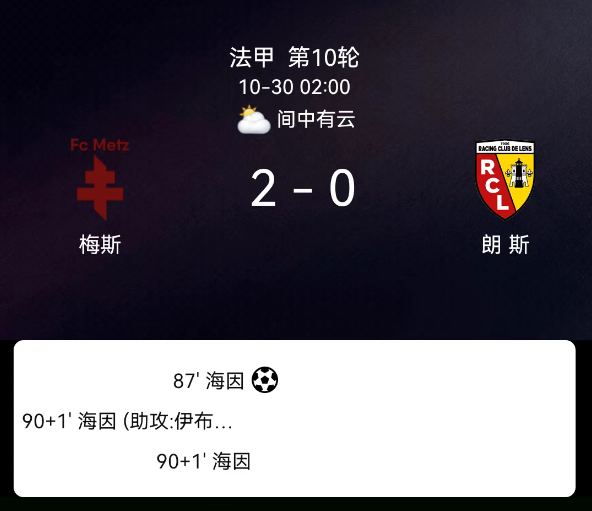 北京时间10月30日,法国足球顶级联赛第10轮,梅斯迎战朗斯。第55分钟,朗斯球员吃黄;第87分钟,艾因破门,梅斯1-0;第90+1分钟,艾因破门,梅斯2-0;第90+2分钟,艾因染红。最终比分,梅斯2-0朗斯。