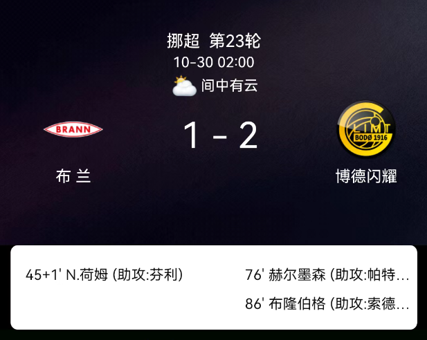 北京时间10月30日,挪威足球超级联赛第23轮,布兰迎战博德闪耀。第45+1分钟,霍尔姆破门,布兰1-0;第58分钟,布兰球员吃黄;第76分钟,赫尔默森破门,博德闪耀1-1;第86分钟,布隆贝格破门,博德闪耀2-1。最终比分,布兰1-2博德闪耀。