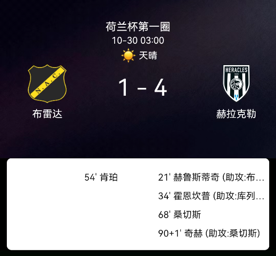北京时间10月30日,荷兰杯第一轮,布雷达迎战赫拉克勒。第21分钟,赫鲁斯蒂奇破门,赫拉克勒1-0;第34分钟,霍恩坎普破门,赫拉克勒2-0;第43分钟,布雷达球员吃黄;第54分钟,肯珀破门,布雷达1-2;第68分钟,伊万德罗-桑谢斯破门,赫拉克勒3-1;第90+1分钟,瓦利德-奇克破门,赫拉克勒4-1。最终比分,布雷达1-4赫拉克勒。