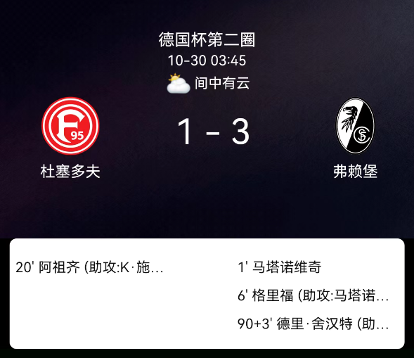 北京时间10月30日,德国足协杯第二轮,杜塞尔多夫迎战弗赖堡。第1分钟,马塔诺维奇破门,弗赖堡1-0;第6分钟,格里福破门,弗赖堡2-0;第18分钟,杜塞尔多夫球员吃黄;第20分钟,阿祖齐破门,杜塞尔多夫1-2;第90+3分钟,舍尔汉特破门,弗赖堡3-1。最终比分,杜塞尔多夫1-3弗赖堡。