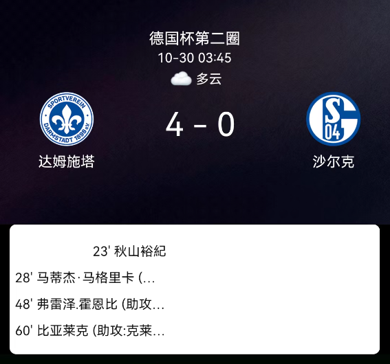 北京时间10月30日,德国足协杯第二轮,达姆施塔特98迎战沙尔克04。第23分钟,秋山裕纪破门,达姆施塔特981-0;第28分钟,马格利卡破门,达姆施塔特982-0;第45分钟,沙尔克球员吃黄;第48分钟,霍恩比破门,达姆施塔特983-0;第60分钟,比亚韦克破门,达姆施塔特984-0。最终比分,达姆施塔特984-0沙尔克04。