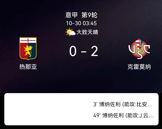北京时间10月30日,意大利足球顶级联赛第9轮,热那亚迎战克雷莫内塞。第4分钟,博纳佐利破门,克雷莫内塞1-0;第38分钟,热那亚球员吃黄;第49分钟,博纳佐利破门,克雷莫内塞2-0。最终比分,热那亚0-2克雷莫内塞。