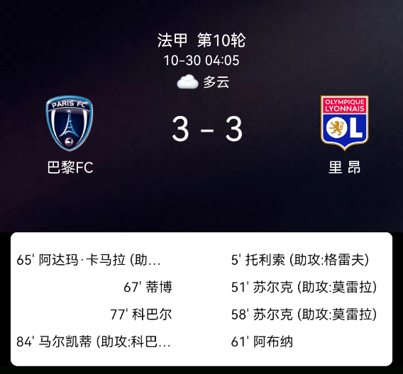 北京时间10月30日,法国足球顶级联赛第10轮,巴黎FC迎战里昂。第5分钟,托利索破门,里昂1-0;第51分钟,舒尔茨破门,里昂2-0;第58分钟,舒尔茨破门,里昂3-0;第61分钟,阿布纳染红;第65分钟,阿达玛-卡马拉破门,巴黎FC1-3;第67分钟,德斯梅染红;第77分钟,凯巴尔破门,巴黎FC2-3;第84分钟,马尔凯蒂破门,巴黎FC3-3。最终比分,巴黎FC3-3里昂。