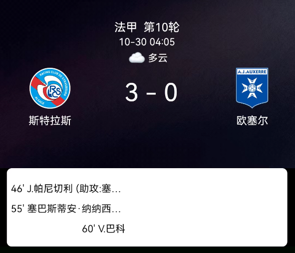 北京时间10月30日,法甲联赛第10轮,斯特拉斯堡迎战欧塞尔。第46分钟,帕尼切利破门,斯特拉斯堡1-0;第52分钟,欧塞尔球员吃黄;第55分钟,纳纳西破门,斯特拉斯堡2-0;第60分钟,巴伦廷-巴尔科破门,斯特拉斯堡3-0。最终比分,斯特拉斯堡3-0欧塞尔。