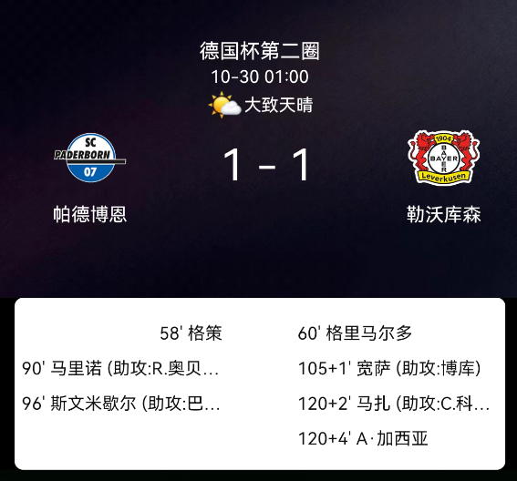 北京时间10月30日,德国足协杯第二轮,帕德博恩迎战勒沃库森。第44分钟,勒沃库森球员吃黄;第58分钟,费利克斯-格策染红;第60分钟,格里马尔多破门,勒沃库森1-0;第90分钟,斯特凡诺-马里诺破门,帕德博恩1-1;加时第96分钟,米歇尔破门,帕德博恩2-1;加时第105分钟,夸安萨破门,勒沃库森2-2;加时第120+2分钟,马扎破门,勒沃库森3-2;加时第120+4分钟,阿莱士-加西亚破门,勒沃库森4-2。最终比分,帕德博恩2-4勒沃库森(加时)。