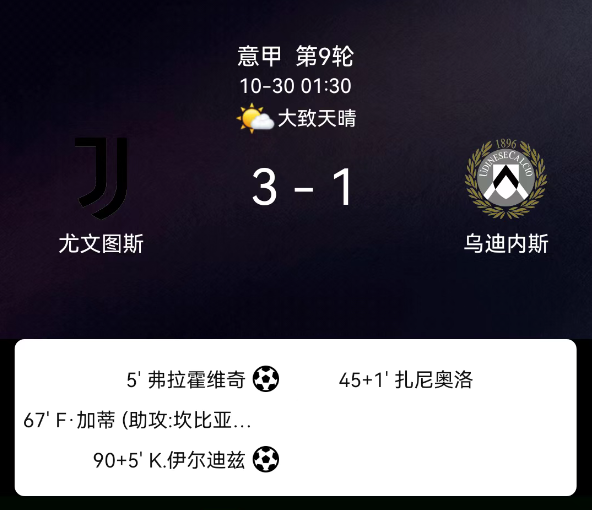 北京时间10月30日,意大利足球顶级联赛第9轮,尤文图斯迎战乌迪内斯。第5分钟,弗拉霍维奇破门,尤文1-0;第38分钟,乌迪内斯球员吃黄;第45+2分钟,扎尼奥洛破门,乌迪内斯1-1;第67分钟,加蒂破门,尤文2-1;第90+6分钟,伊尔迪兹破门,尤文3-1。最终比分,尤文图斯3-1乌迪内斯。