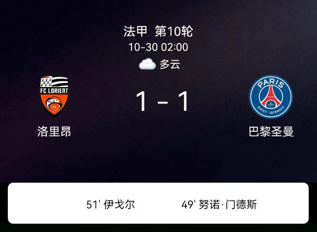 北京时间10月30日,法国足球甲级联赛第10轮,洛里昂迎战巴黎圣日耳曼。第38分钟,巴黎球员吃黄;第49分钟,门德斯破门,巴黎1-0;第51分钟,卡里奥卡破门,洛里昂1-1。最终比分,洛里昂1-1巴黎圣日耳曼。