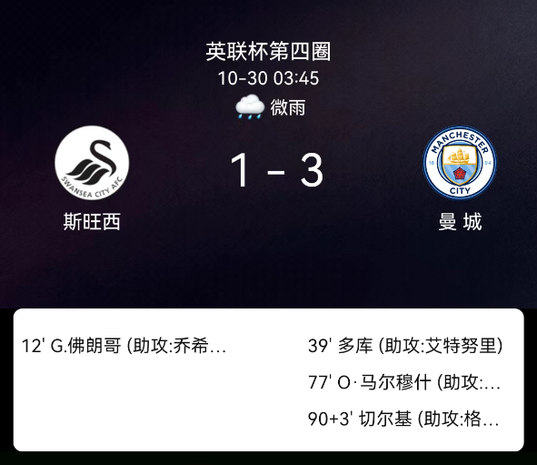 北京时间10月30日,英格兰联赛杯第四轮,斯旺西迎战曼城。第12分钟,佛朗哥破门,斯旺西1-0;第22分钟,伊达吃黄;第40分钟,多库破门,曼城1-1;第77分钟,马尔穆什破门,曼城2-1;第90+3分钟,谢尔基破门,曼城3-1。最终比分,斯旺西1-3曼城。