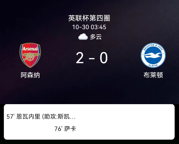 北京时间10月30日3:45,英联杯第四轮,阿森纳迎战布莱顿。第34分钟,迭戈-科波拉吃黄;第57分钟,恩瓦内里破门,阿森纳1-0;第76分钟,萨卡破门,阿森纳2-0;第86分钟,奥利维尔-博斯卡利吃黄。最终比分,阿森纳2-0布莱顿。