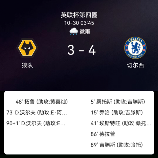北京时间10月30日,英格兰联赛杯第四轮,狼队迎战切尔西。第5分钟,桑托斯破门,切尔西1-0;第15分钟,乔治破门,切尔西2-0;第41分钟,埃斯特旺破门,切尔西3-0;第48分钟,阿罗科达雷破门,狼队1-3;第73分钟,沃尔费破门,狼队2-3;第86分钟,德拉普染红;第89分钟,吉滕斯破门,切尔西4-2;第90+1分钟,沃尔费破门,狼队3-4。最终比分,狼队3-4切尔西。