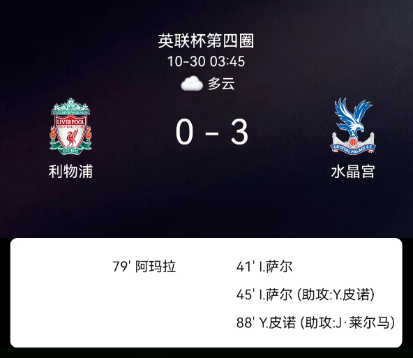 北京时间10月30日3:45,英联杯第四轮,利物浦迎战水晶宫。第41分钟,伊斯梅拉-萨尔破门,水晶宫1-0;第45分钟,伊斯梅拉-萨尔破门,水晶宫2-0;第55分钟,罗伯逊吃黄;第79分钟,纳洛染红;第88分钟,耶雷米-皮诺破门,水晶宫3-0。最终比分,利物浦0-3水晶宫。