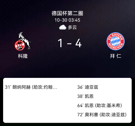 北京时间10月30日,德国足协杯第二轮,科隆迎战拜仁。第5分钟,马拉吃黄;第31分钟,阿赫破门,科隆1-0;第36分钟,迪亚斯破门,拜仁1-1;第40分钟,凯恩破门,拜仁2-1;第65分钟,凯恩破门,拜仁3-1;第72分钟,奥利塞破门,拜仁4-1。最终比分,科隆1-4拜仁慕尼黑。