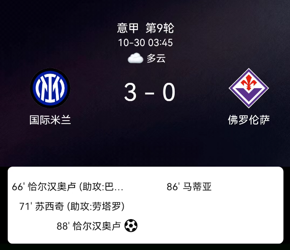 北京时间10月30日,意大利足球顶级联赛第9轮,国际米兰迎战佛罗伦萨。第48分钟,维蒂吃黄;第66分钟,恰尔汗奥卢破门,国米1-0;第71分钟,苏契奇破门,国米2-0;第86分钟,维蒂染红,恰尔汗奥卢破门,国米3-0。最终比分,国际米兰3-0佛罗伦萨。