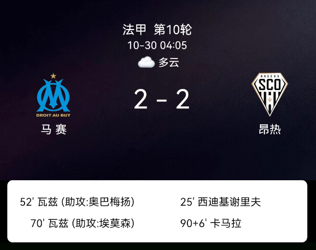 北京时间10月30日,法国足球顶级联赛第10轮,马赛迎战昂热。第25分钟,西迪基-谢里夫破门,昂热1-0;第30分钟,马赛球员尼尔-莫派吃黄;第52分钟,罗比尼奥-瓦斯破门,马赛1-1;第70分钟,罗比尼奥-瓦斯破门,马赛2-1;第90+6分钟,奥斯曼-卡马拉破门,昂热2-2。最终比分,马赛2-2昂热。
