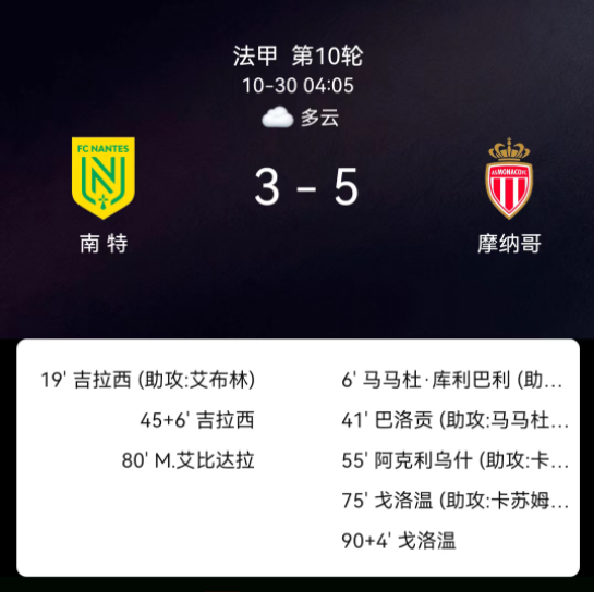 北京时间10月30日,法国足球顶级联赛第10轮,南特迎战摩纳哥。第6分钟,马马杜-库利巴利破门,摩纳哥1-0;第19分钟,吉拉西破门,南特1-1;第35分钟,南特球员吃黄;第41分钟,巴洛贡破门,摩纳哥2-1;第45+7分钟,吉拉西破门,南特2-2;第55分钟,阿克利乌什破门,摩纳哥3-2;第75分钟,戈洛温破门,摩纳哥4-2;第80分钟,穆斯塔法-穆罕默德破门,南特3-4;第90+4分钟,戈洛温破门,摩纳哥5-3。最终比分,南特3-5摩纳哥。