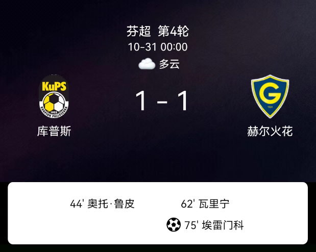 北京时间10月31日,芬兰足球超级联赛争冠组第4轮,库普斯迎战格尼斯坦。第38分钟,库普斯球员吃黄;第44分钟,奥托-罗皮破门,库普斯1-0;第75分钟,罗曼-叶廖缅科破门,格尼斯坦1-1。最终比分,库普斯1-1格尼斯坦。