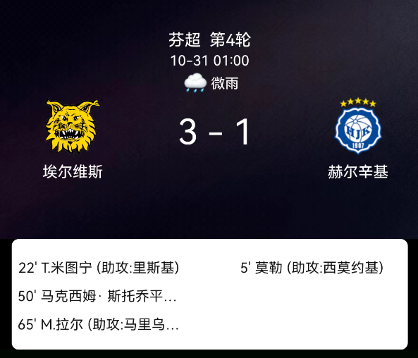 北京时间10月31日,芬兰足球超级联赛争冠组第4轮,埃尔维斯迎战赫尔辛基。第5分钟,利亚姆-默勒破门,赫尔辛基1-0;第22分钟,米图宁破门,埃尔维斯1-1;第48分钟,赫尔辛基球员吃黄;第50分钟,斯特约平破门,埃尔维斯2-1;第65分钟,拉莱破门,埃尔维斯3-1。最终比分,埃尔维斯3-1赫尔辛基。