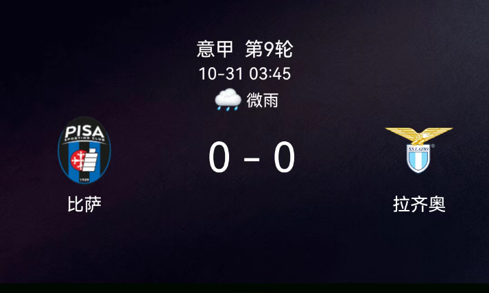 北京时间10月31日,意大利足球顶级联赛第9轮,比萨迎战拉齐奥。第41分钟,迪农吃黄;全场无进球。最终比分,比萨0-0拉齐奥。