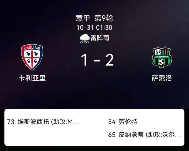 北京时间10月31日,意大利足球顶级联赛第9轮,卡利亚里迎战萨索洛。第45分钟,卡利亚里球员吃黄;第54分钟,劳伦特破门,萨索洛1-0;第65分钟,皮纳蒙蒂破门,萨索洛2-0;第73分钟,埃斯波西托破门,卡利亚里1-2。最终比分,卡利亚里1-2萨索洛。