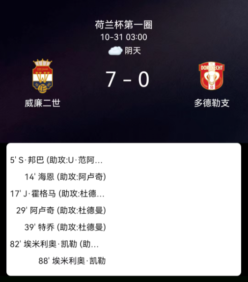 北京时间10月31日,荷兰杯第一轮,威廉二世迎战多德勒支。第5分钟,班巴破门,威廉二世1-0;第14分钟,德芬-亨破门,威廉二世2-0;第17分钟,霍格马破门,威廉二世3-0;第25分钟,多德勒支球员吃黄;第29分钟,阿卢奇破门,威廉二世4-0;第39分钟,周亚安破门,威廉二世5-0;第82分钟,克雷尔破门,威廉二世6-0;第88分钟,克雷尔破门,威廉二世7-0。最终比分,威廉二世7-0多德勒支。