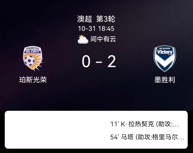 北京时间10月31日,澳大利亚足球超级联赛第3轮,珀斯光荣迎战墨尔本胜利。第11分钟,耶拉契奇破门,墨尔本胜利1-0;第35分钟,珀斯光荣球员吃黄;第54分钟,马塔破门,墨尔本胜利2-0。最终比分,珀斯光荣0-2墨尔本胜利。