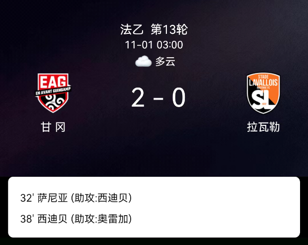 北京时间11月1日,法国足球乙级联赛第13轮,甘冈迎战拉瓦勒。第25分钟,拉瓦勒球员吃黄;第32分钟,A-萨尼亚破门,甘冈1-0;第38分钟,西迪贝破门,甘冈2-0。最终比分,甘冈2-0拉瓦勒。