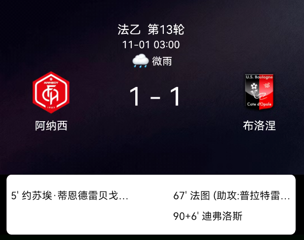 北京时间11月1日,法国足球乙级联赛第13轮,阿讷西迎战博莱格尼。第5分钟,蒂恩德雷贝奥果破门,阿讷西1-0;第41分钟,普尔西奇吃首黄;第67分钟,CorentinFatou破门,博莱格尼1-1;第90+6分钟,普尔西奇吃二黄染红。最终比分,阿讷西1-1博莱格尼。