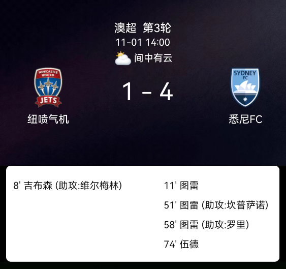 北京时间11月1日,澳大利亚足球超级联赛第3轮,纽卡斯尔喷气机迎战悉尼。第8分钟,本-吉布森破门,纽卡斯尔喷气机1-0;第11分钟,阿尔哈桑-杜尔破门,悉尼1-1;第51分钟,阿尔哈桑-杜尔破门,悉尼2-1;第58分钟,阿尔哈桑-杜尔破门,悉尼3-1;第74分钟,帕特里克-伍德破门,悉尼4-1。最终比分,纽卡斯尔喷气机1-4悉尼。