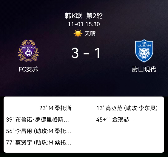 北京时间11月1日,韩国经典K联赛保级组第2轮,安养迎战蔚山HD。第13分钟,高丞范破门,蔚山HD1-0;第39分钟,布鲁诺-莫塔破门,安养1-1;第45+1分钟,金珉赫染红,蔚山HD10人应战;第56分钟,李昌勇破门,安养2-1;第77分钟,蔡贤宇破门,安养3-1。最终比分,安养3-1蔚山HD。