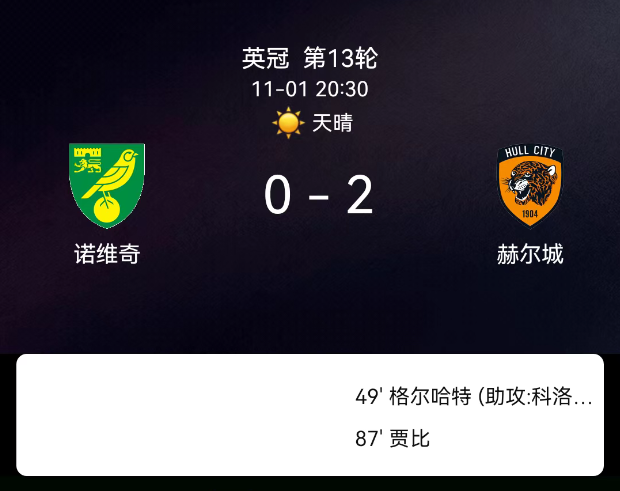 北京时间11月1日,英格兰足球冠军联赛第13轮,诺维奇迎战赫尔城。第35分钟,诺维奇球员吃黄;第49分钟,格尔哈特破门,赫尔城1-0;第72分钟,赫尔城球员吃黄;第87分钟,格亚比破门,赫尔城2-0。最终比分,诺维奇0-2赫尔城。