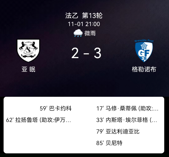 北京时间11月1日,法国足球乙级联赛第13轮,亚眠迎战格勒诺布尔。第17分钟,尚蒂佩破门,格勒诺布尔1-0;第33分钟,NestaElphege破门,格勒诺布尔2-0;第45分钟,亚眠球员吃黄;第59分钟,西亚卡-巴卡约科破门,亚眠1-2;第62分钟,拉扬-卢廷破门,亚眠2-2;第79分钟,亚达利-迪亚比破门,格勒诺布尔3-2。最终比分,亚眠2-3格勒诺布尔。
