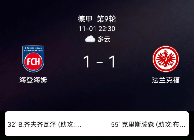 北京时间11月1日,德国足球顶级联赛第9轮,海登海姆迎战法兰克福。第33分钟,齐夫齐瓦泽破门,海登海姆1-0;第49分钟,法兰克福球员吃黄;第55分钟,克里斯滕森破门,法兰克福1-1;第82分钟,海登海姆球员吃黄。最终比分,海登海姆1-1法兰克福。